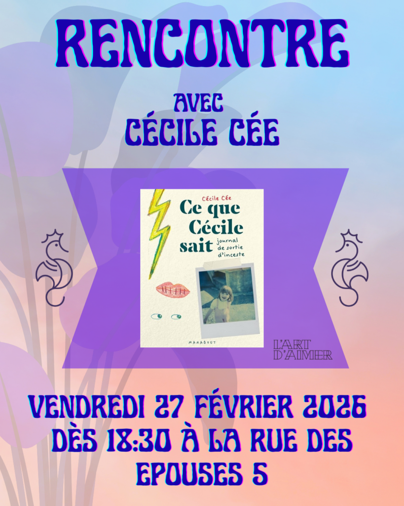 👉 Vendredi 27 février 2026 à 18h30, l’autrice viendra présenter son livre Ce que Cécile sait : journal de sortie d’inceste et échanger avec vous autour de ce sujet.